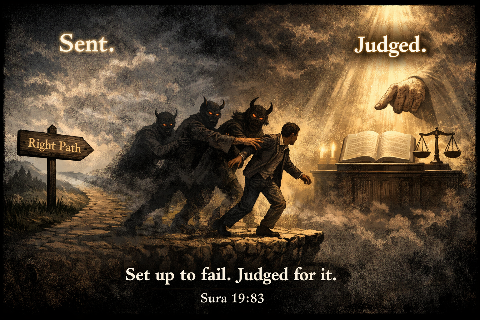 De gebruikelijke verdediging luidt dat deze mensen “al verkeerd zaten” en dat de duivels hen slechts verder op dat pad brengen. Maar dat roept onmiddellijk een probleem op. Als iemand al afdwaalt, en God besluit vervolgens actief krachten te sturen die hem nog verder laten afdwalen, wie draagt dan uiteindelijk de verantwoordelijkheid? De mens — of degene die de misleiding faciliteert?