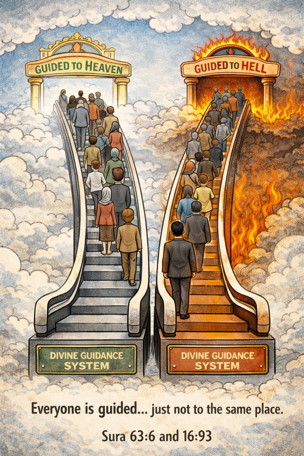 Wanneer men Quran 63:6 en Quran 16:93 naast elkaar zet, ontstaat er een duidelijke spanning. Het eerste vers stelt dat God de zondige mensen niet leidt, wat impliceert dat zij zelf verantwoordelijk zijn voor hun toestand en dat God hen eenvoudigweg geen leiding geeft. Het tweede vers zegt echter dat God laat dwalen wie Hij wil, wat suggereert dat het dwalen van mensen uiteindelijk door God wordt veroorzaakt of bepaald.