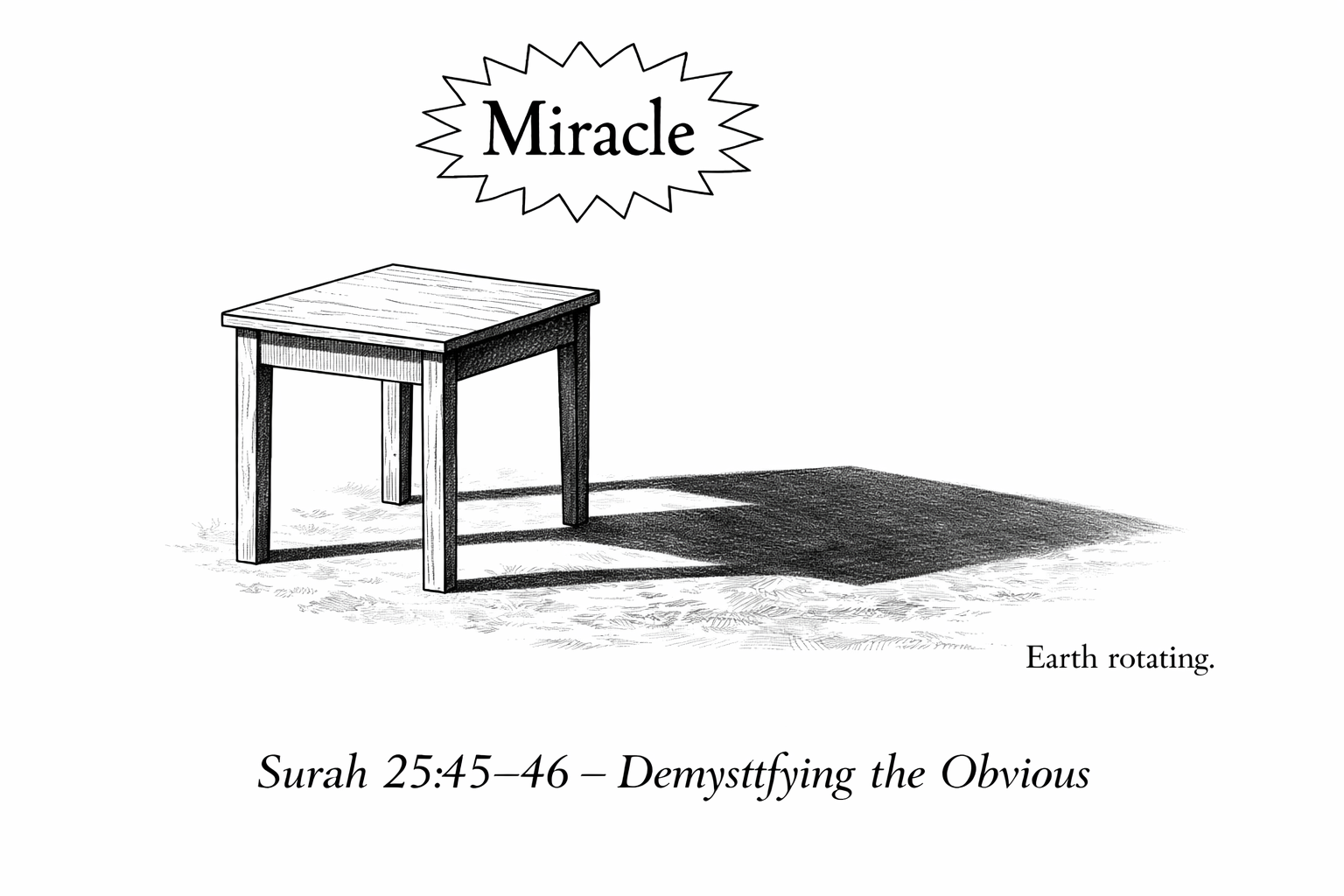 - “De aarde roteert, de zon reist haar baan, en de schaduwen volgen. Maar volgens Soera 25:45-46 moet een almachtige elke centimeter verlengen — een kosmische microbeheer die alleen geloof kan verkopen.”