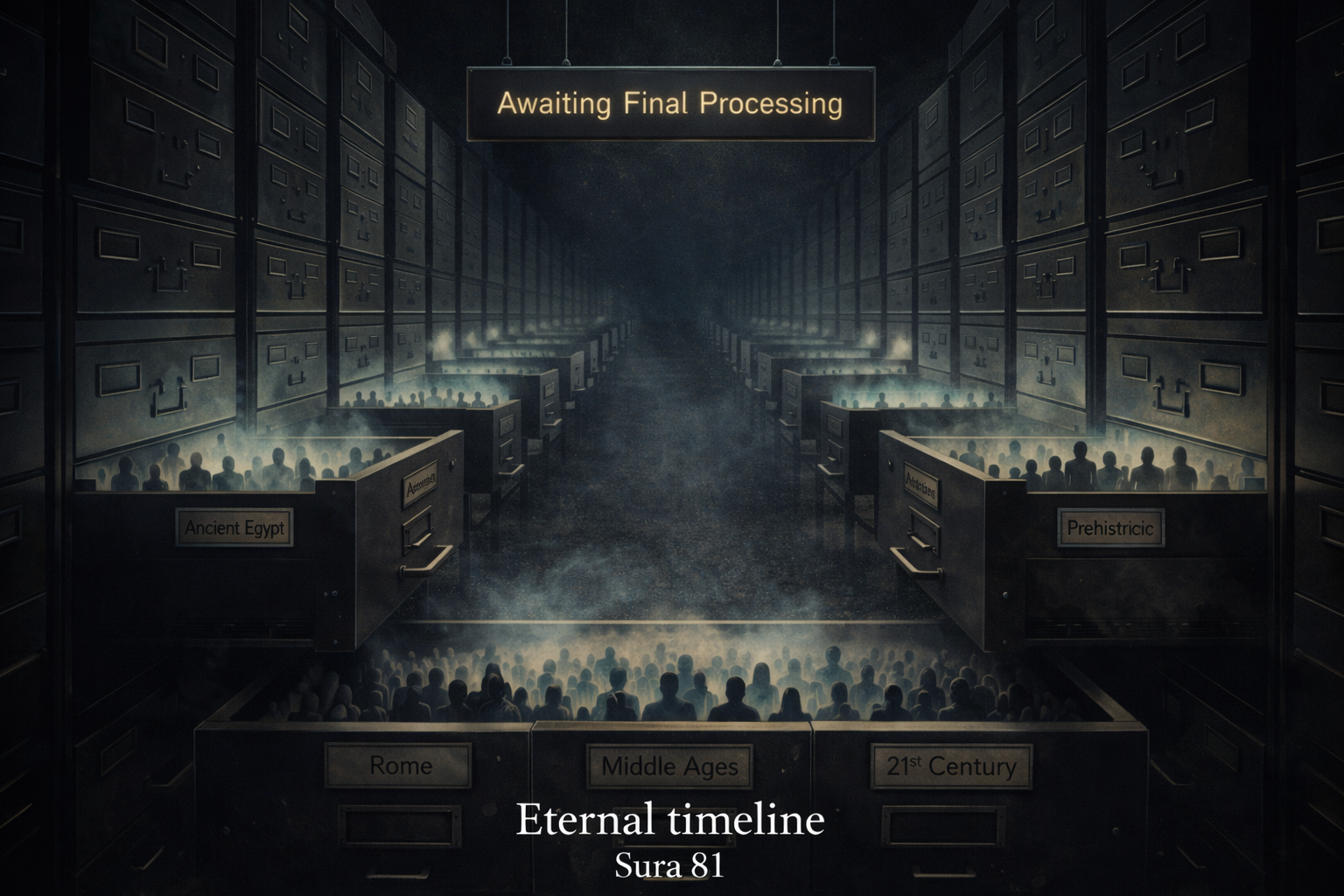 Als hemel en hel “worden nadergebracht” en “ontstoken”, dan bestaan zij blijkbaar al. Dat impliceert een wachtruimte voor de doden. Een tussenfase. Een kosmische opslagplaats voor bewustzijn. En inderdaad: dat betekent dat er volgens dit model miljarden mensen zijn die al millennia wachten. Sommigen — als men de menselijke geschiedenis serieus neemt — tienduizenden, wellicht honderdduizenden jaren.