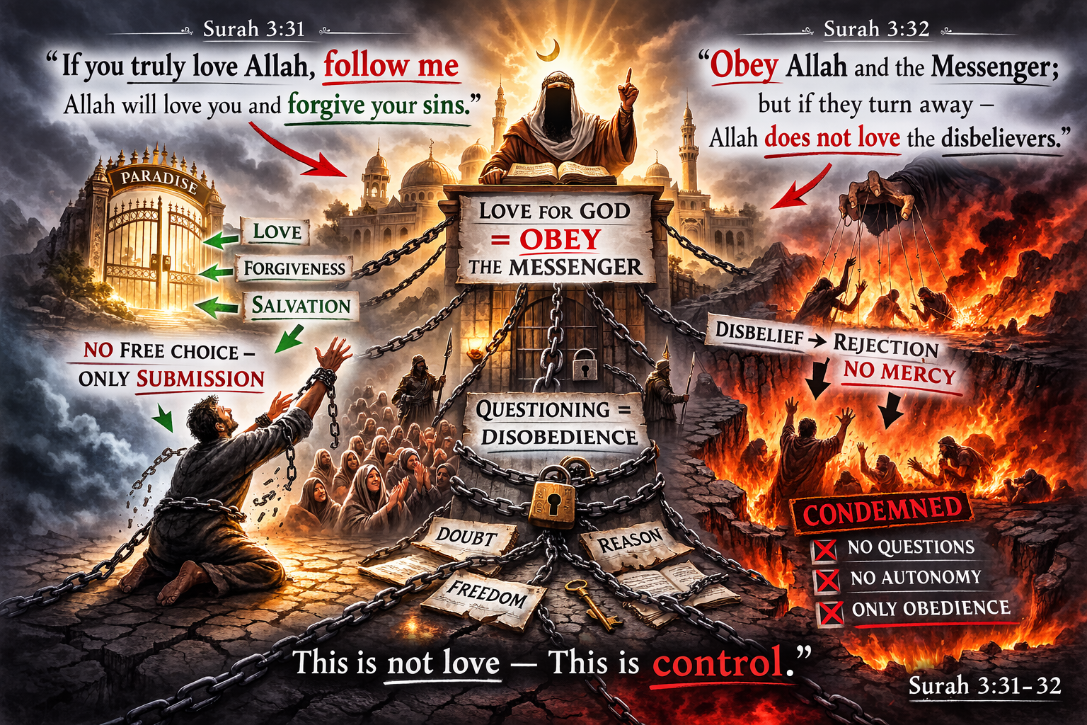 De verzen 3:31–32 creëren een krachtige psychologische structuur. Liefde voor God wordt afhankelijk gemaakt van gehoorzaamheid aan een specifieke figuur — in dit geval Muhammad. Dat alleen al plaatst het individu in een dubbele druk: niet alleen een interne morele druk (“hou ik van God?”), maar ook een sociale druk: gehoorzaamheid wordt het criterium voor groepsacceptatie.