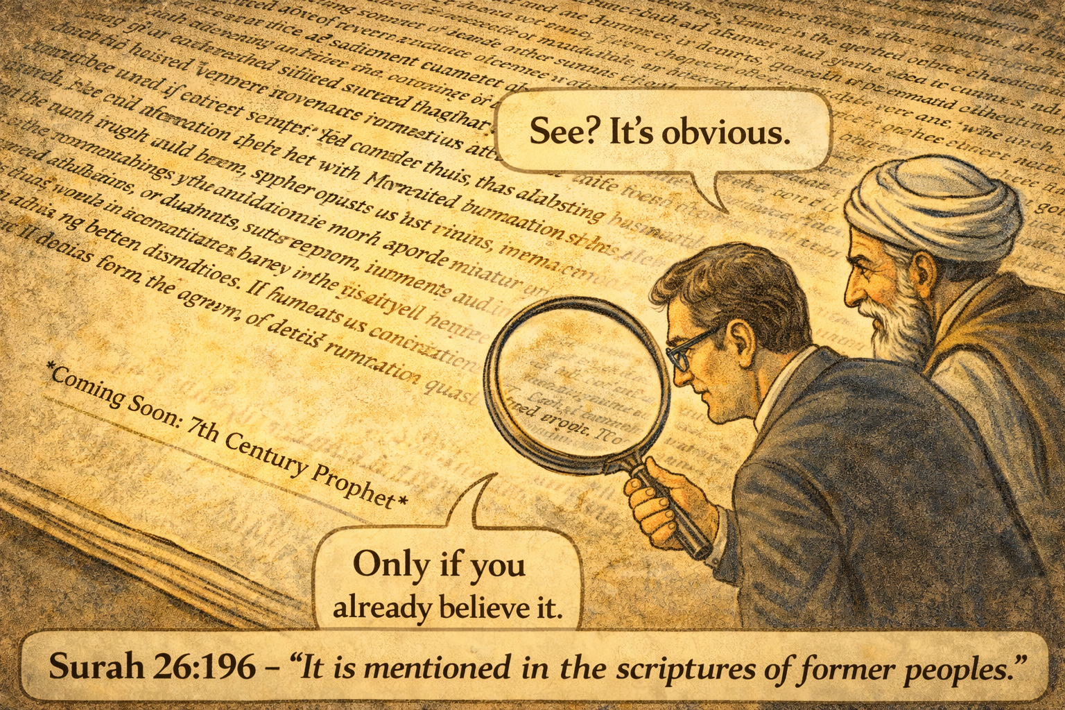 Soera 26:196 beweert met een bijna achteloze zekerheid dat de Koran al werd aangekondigd in de eerdere geschriften — de Torah en het Evangelie. Dat is geen bescheiden claim. Dat is kosmische marketing van de hoogste orde: niet alleen is dit boek waar, het stond al in de eerdere bestsellers aangekondigd.