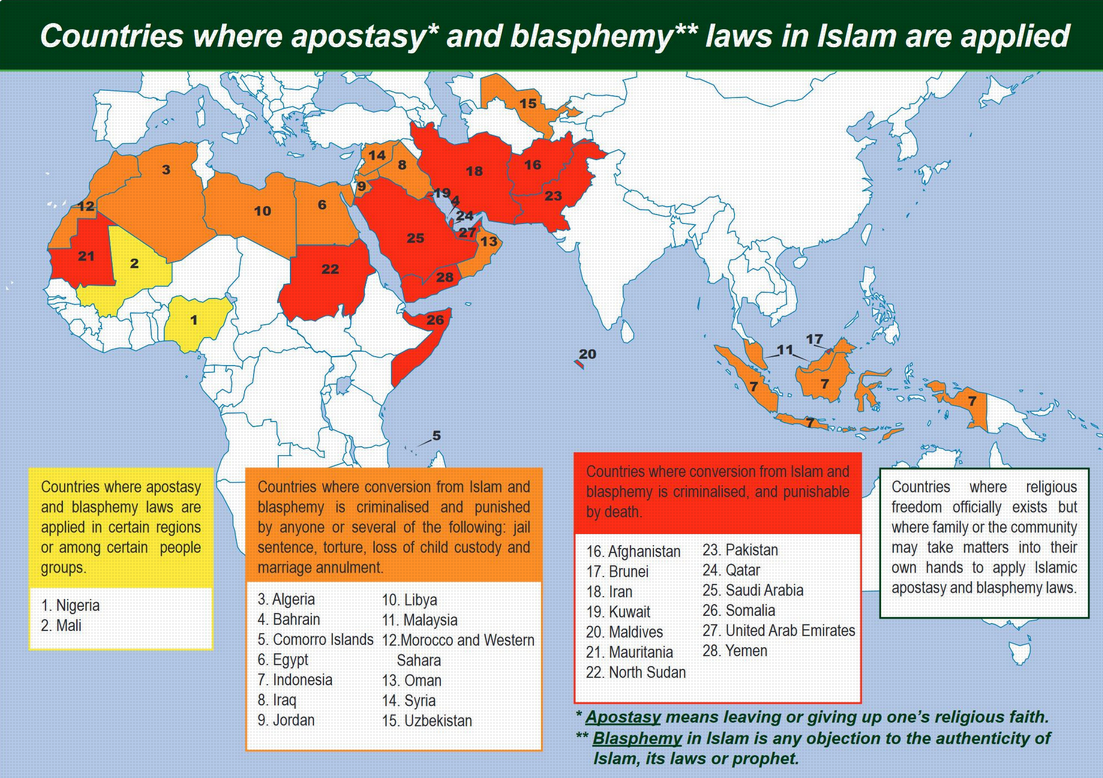 Andere landen beperken het tot blasphemie, bedreiging van staatsveiligheid, of aanzetten tot afvalligheid (Marokko, Maleisië).