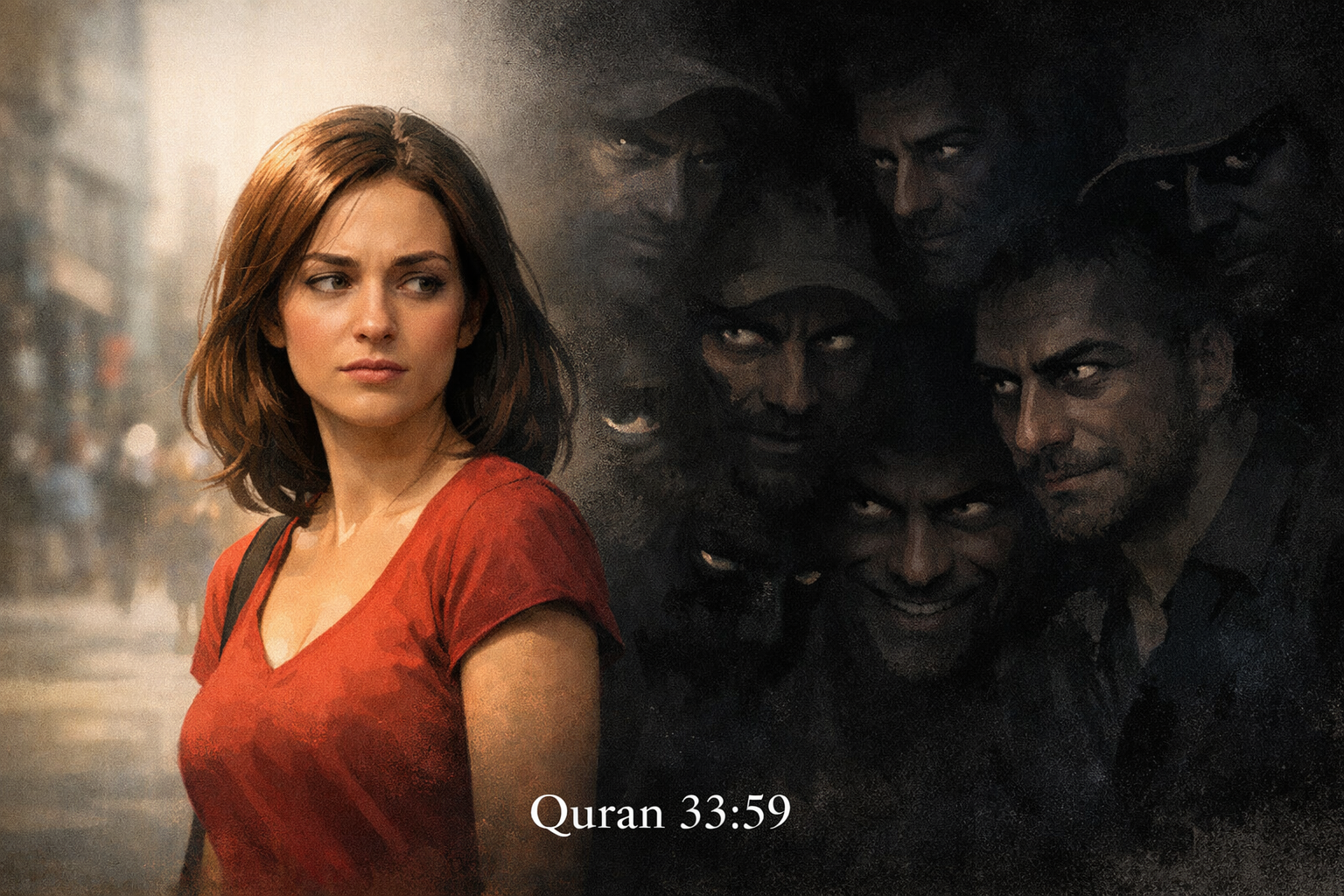Soera 33:59. ”O Profeet! Zeg tegen uw vrouwen, uw dochters en de vrouwen van de gelovigen dat zij hun sluiers volledig over hun lichaam moeten trekken (d.w.z. zich volledig moeten bedekken, behalve de ogen of één oog om de weg te kunnen zien). Dat is beter, zodat zij herkend worden (als vrije, respectabele vrouwen) en niet lastiggevallen worden.”