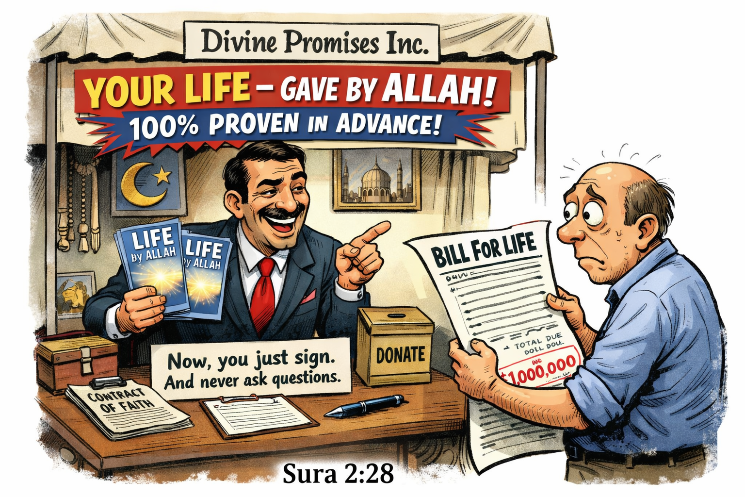 De conclusie wordt simpelweg als feit gepresenteerd. ‘God gaf je leven – hoe kun je Hem ontkennen?’ Maar dat is geen argument; het is een aanname verpakt als beschuldiging. Eerst wordt een schepper verondersteld als een waarheid, vervolgens wordt ongeloof behandeld alsof het ondankbaarheid is. Het is alsof iemand u een rekening stuurt voor een dienst waarvan nooit is aangetoond dat u die hebt ontvangen, en u daarna moreel berispt omdat u weigert te betalen. In elk ander domein zouden we dit onmiddellijk herkennen als een cirkelredenering. Maar wanneer religie het doet, wordt de logische sprong plotseling heilig verklaard.