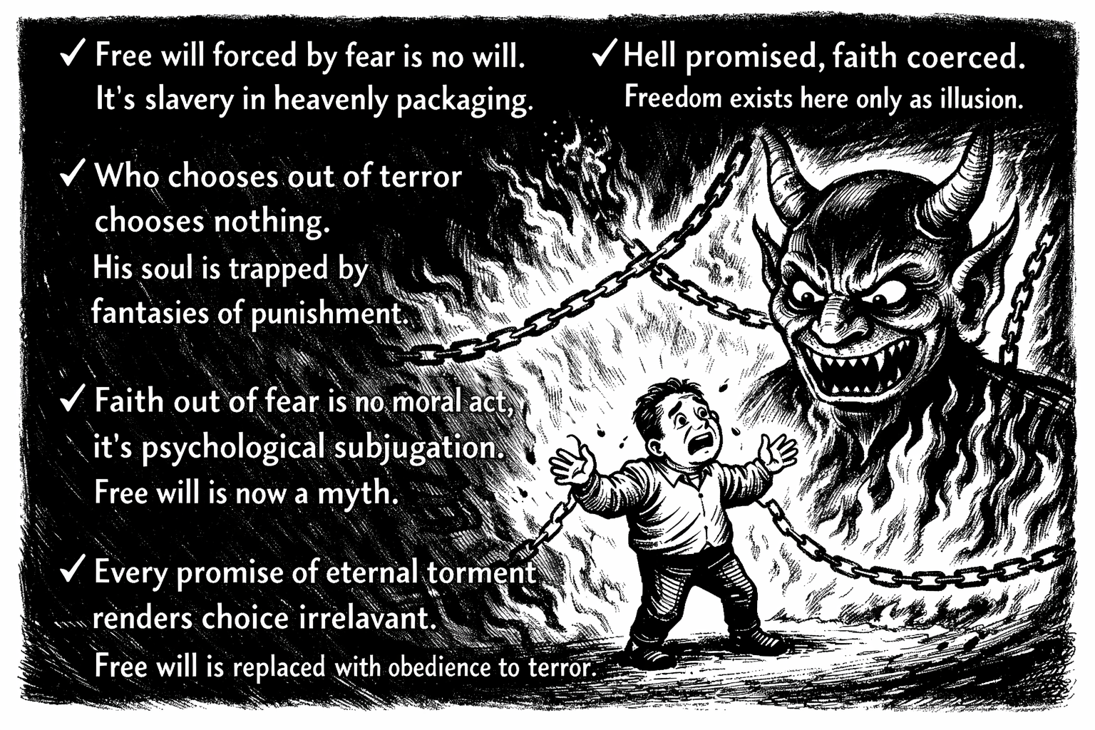 Vrije wil onder dreiging van de hel is een illusie. Wie gelooft uit angst, kiest niet; hij onderwerpt zich, en elke bewering dat dit ‘vrij’ is, is een retorische misleiding.