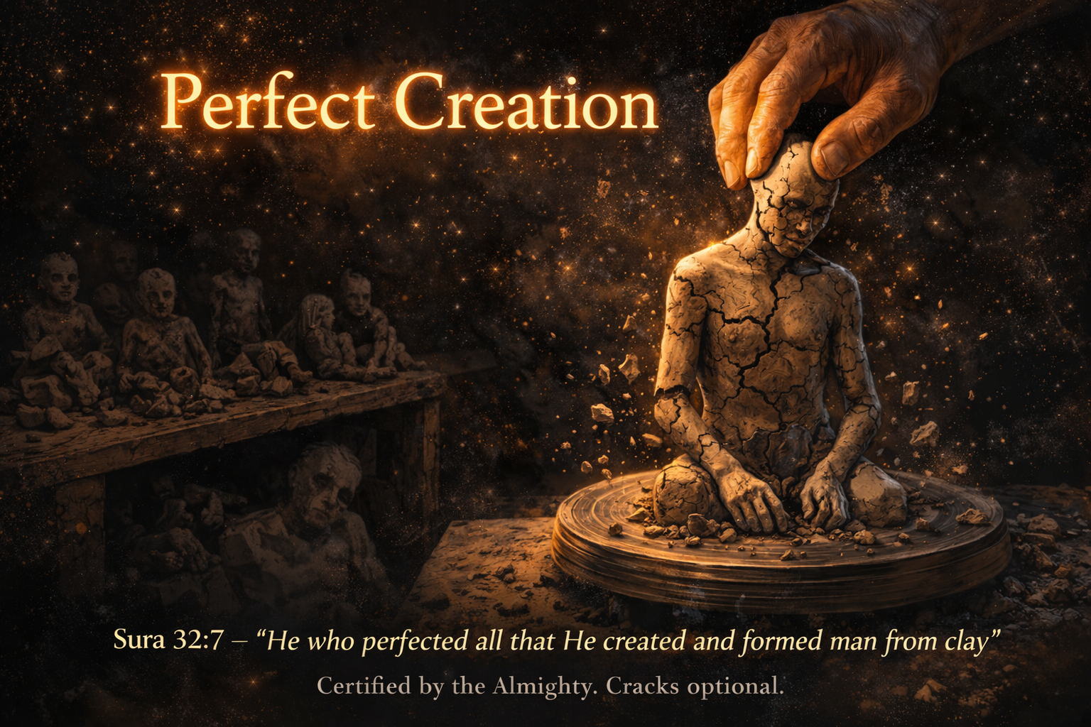 32:7 ”Hij die alles wat Hij geschapen heeft, volmaakt heeft gemaakt en de mens uit klei heeft geschapen.”