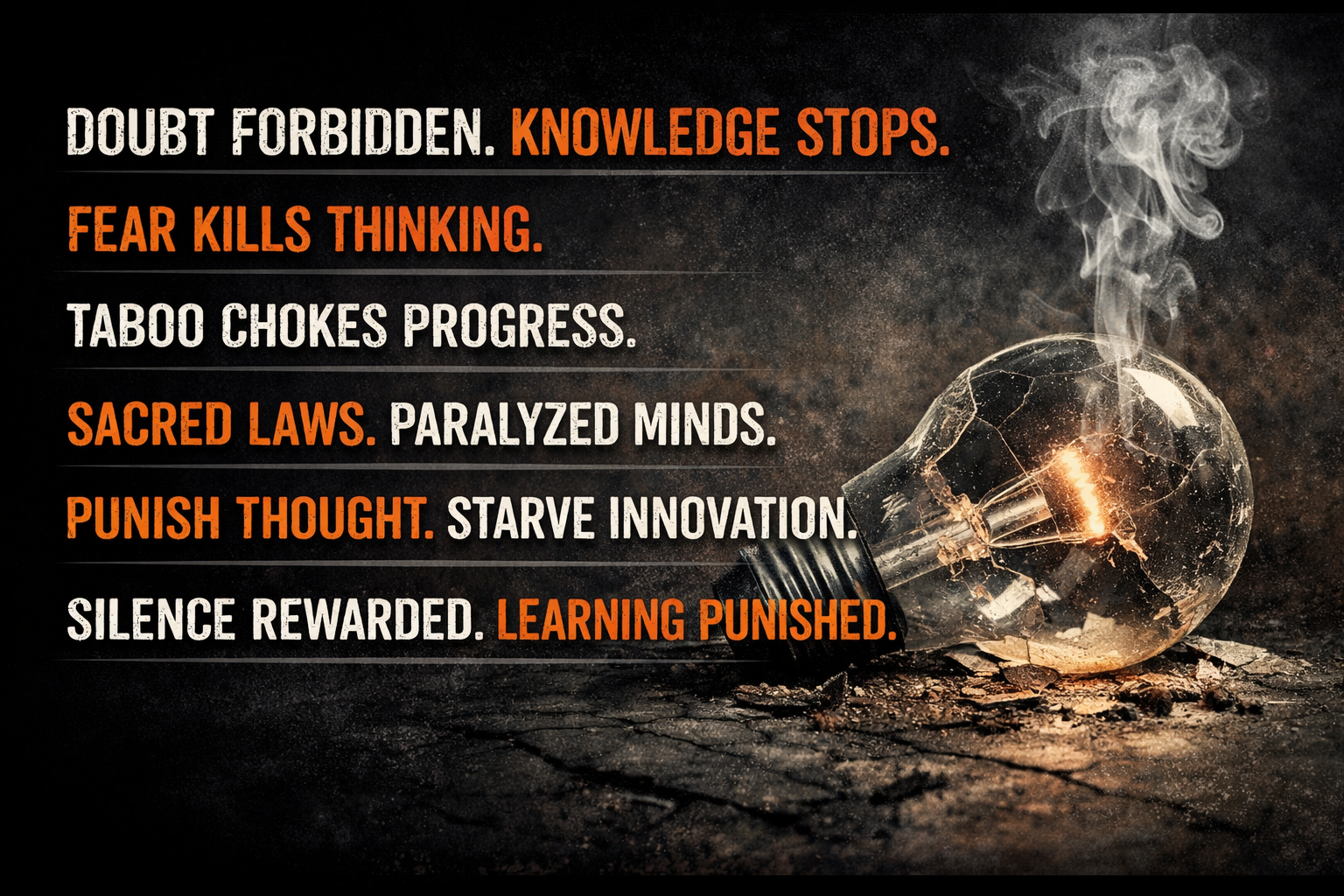Wanneer vragen stellen of twijfelen sociaal of juridisch bestraft wordt, wordt kritiek gepercipieerd als verraad en twijfel als verdacht. Loyaliteit gaat boven waarheid. Hierdoor wordt dogma belangrijker dan bewijs, autoriteit vervangt argument, en consensus wordt afgedwongen in plaats van bereikt. Het gevolg is pseudowetenschap, stilstand en een angstcultuur. Waar taboe begint, eindigt kennis.