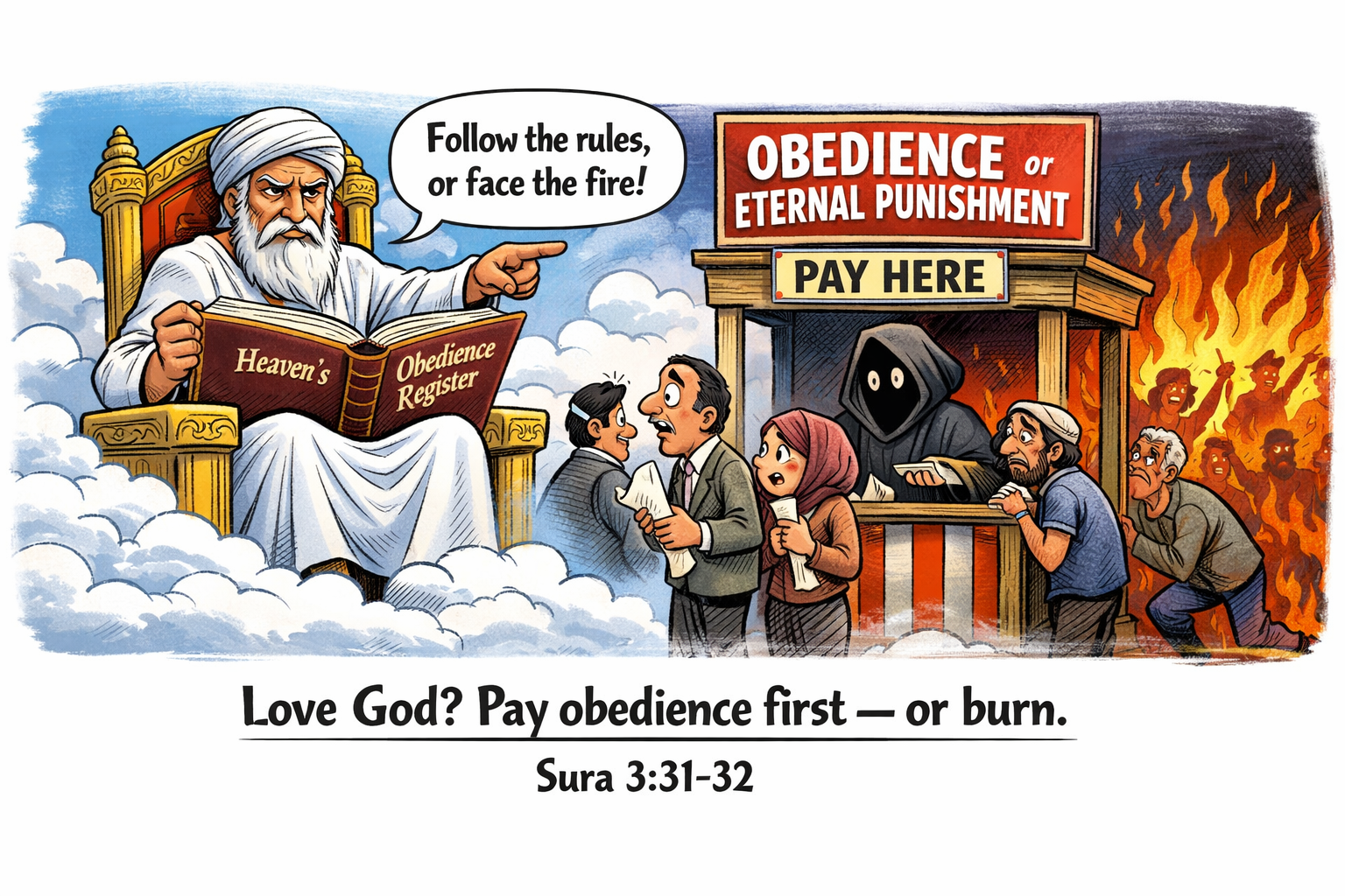 Een kritische anlyse: ”Gehoorzaam mij en God houdt van je, of trotseer mij en je gaat branden — goddelijke afpersing, vermomd als toewijding.”