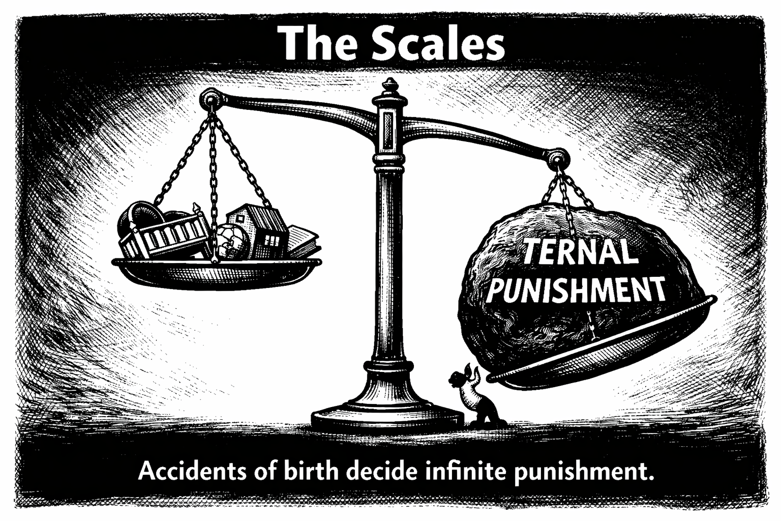 Religie rechtvaardigt ongelijkheid door persoonlijke verantwoordelijkheid te idealiseren en context weg te rationaliseren. Maar echte willekeur kent geen moraliteit. Het is blind, hard en zonder compassie. Het idee van eeuwige straf voor ongeloof, gebaseerd op het toeval van geboorte of opvoeding, is niet wijsheid; het is tirannie. Het dient niet om moreel inzicht te geven, maar om gehoorzaamheid af te dwingen, angst te cultiveren en de kwetsbaren te controleren.