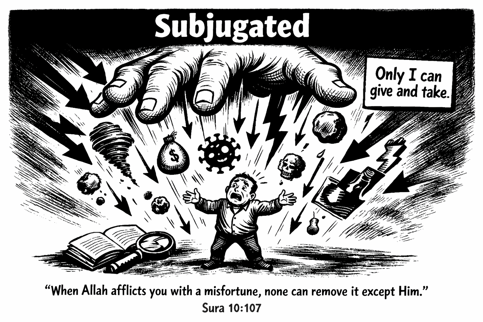 “Soera 10:107 zegt dat alle tegenspoed van Allah komt en alleen Hij deze kan wegnemen. Het is geen troost, het is een wapen: oorzaak en remedie samengebracht om elke autonomie te vernietigen. Het vers bouwt een systeem van totale onderwerping waarin de mens geen keuze heeft, alleen gehoorzaamheid.”