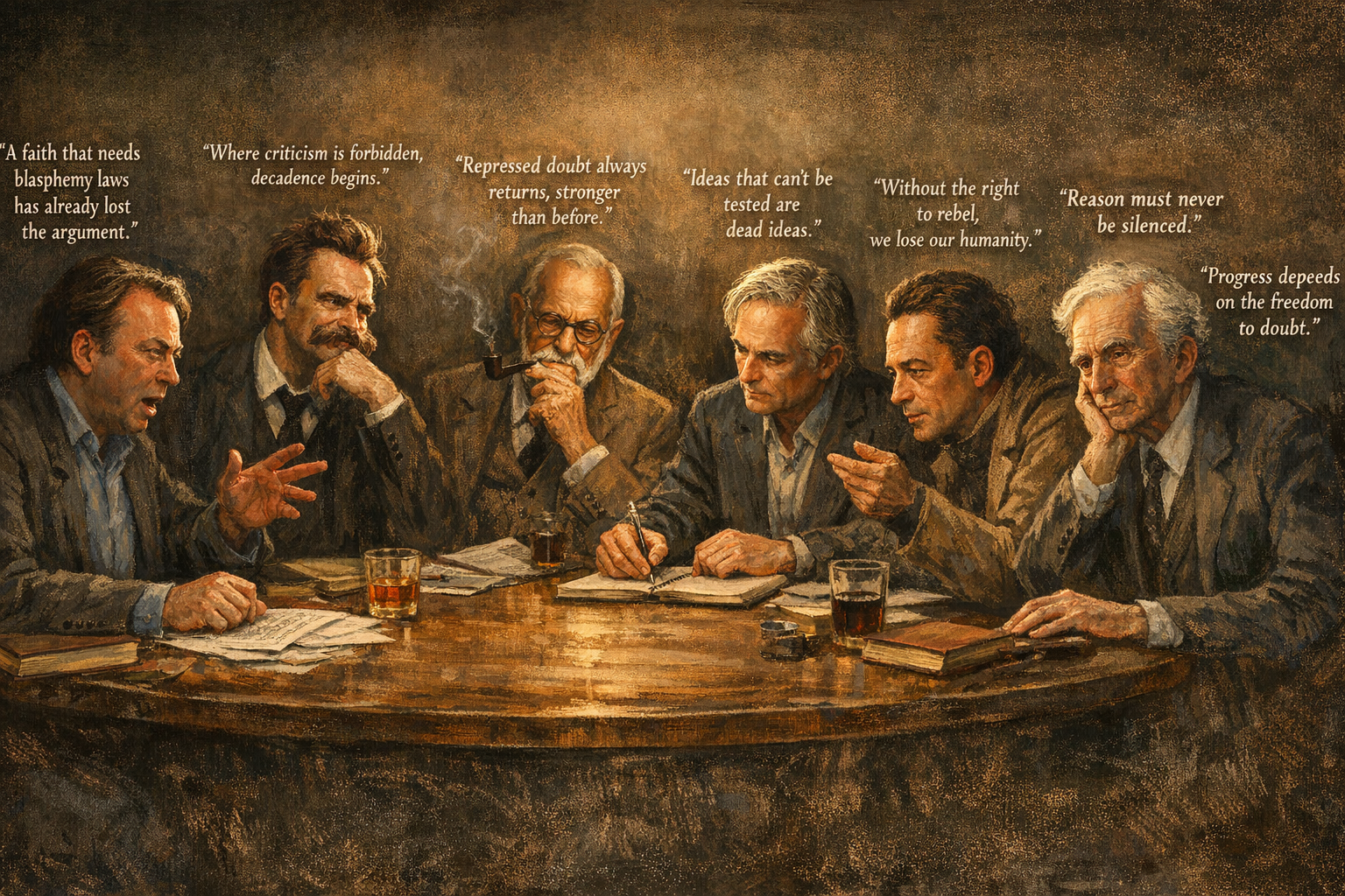 Een denkbeeldig rondetafelgesprek tussen Hitchens, Nietzsche, Freud, Dawkins, Camus, Spinoza en Russell, over blasfemiewetten en hun impact op vrijheid, wetenschap en intellect.