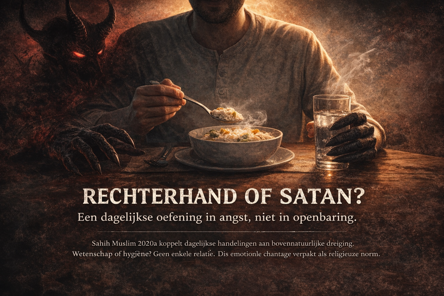 De hadith over rechterhandgebruik is een voorbeeld van hoe religie cultuur, ritueel en angst vermengt: Het gaat niet om voeding, hygiëne of wetenschap, maar om discipline door bovennatuurlijke dreiging.