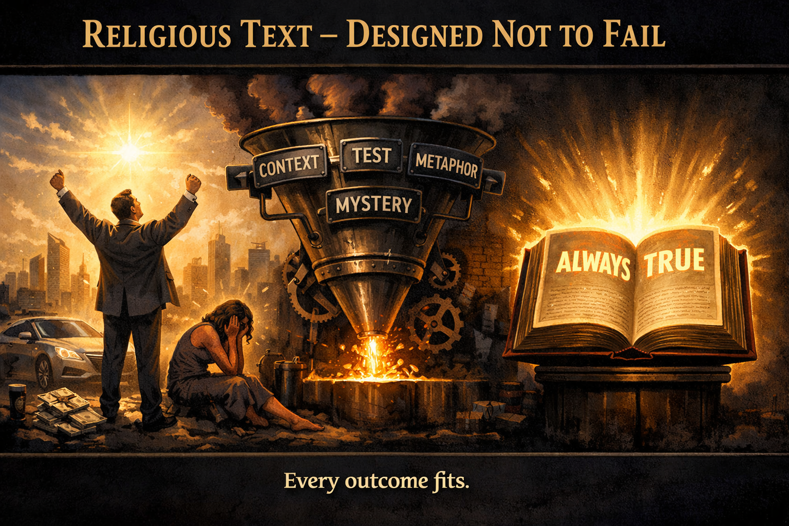 Laten we het concreet maken. Niet met abstracte filosofie, maar met uitspraken die zich presenteren als waarheid — en vervolgens op zo’n manier worden geïnterpreteerd dat zij die waarheid nooit meer kunnen verliezen: een systeem waarin elke uitkomst zo wordt geïnterpreteerd dat de bewering overeind blijft, en waarin falen simpelweg niet meer tot de opties behoort.
