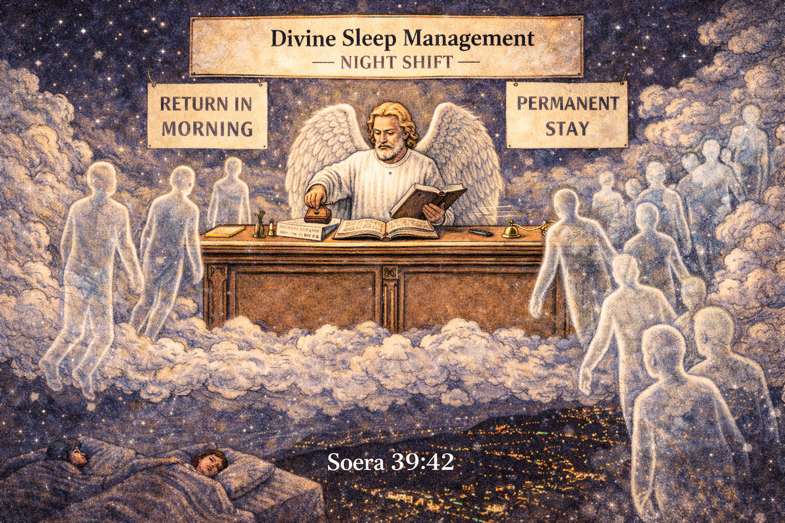 Soera 39:42 klinkt als kosmische wijsheid: God “neemt de zielen” tijdens slaap en dood, en sommige houdt Hij vast terwijl Hij anderen vrijlaat. Maar wat zegt het werkelijk? Dat slapen voelt als verdwijnen en ontwaken als terugkeren — niets meer, niets minder. Geen ziel die komt of gaat, geen goddelijke opslagplaats. Het vers verheft een alledaagse ervaring tot bovennatuurlijke verklaring en kleedt intuïtie in een kosmische pracht. En dat alles verpakt als “teken voor wie nadenkt.” Nadenken levert hier geen bewijs, alleen het besef dat de zogenaamde openbaring niets toevoegt aan wat ieder mens al kan observeren: dat bewustzijn komt en gaat. Tijdloze kosmische kennis? Nee. Oud wereldbeeld met religieuze flair? Zeker.