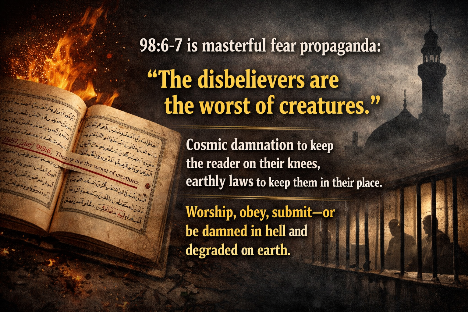 Koran 98:6-7 noemt niet-moslims de “slechtste der schepselen”, en moslims de “beste der schepselen”. Deze tekst is bespottelijk en ongeloofwaardig omdat het moslims neerzet als hoogste wezens en niet-moslims als lager dan dieren. Dat is echter praktisch en logisch onmogelijk: mensen functioneren in de samenleving, vormen relaties, werken samen, bouwen wetenschap en cultuur — je kunt ze niet letterlijk tot de slechtste wezens reduceren terwijl ze hier leven.