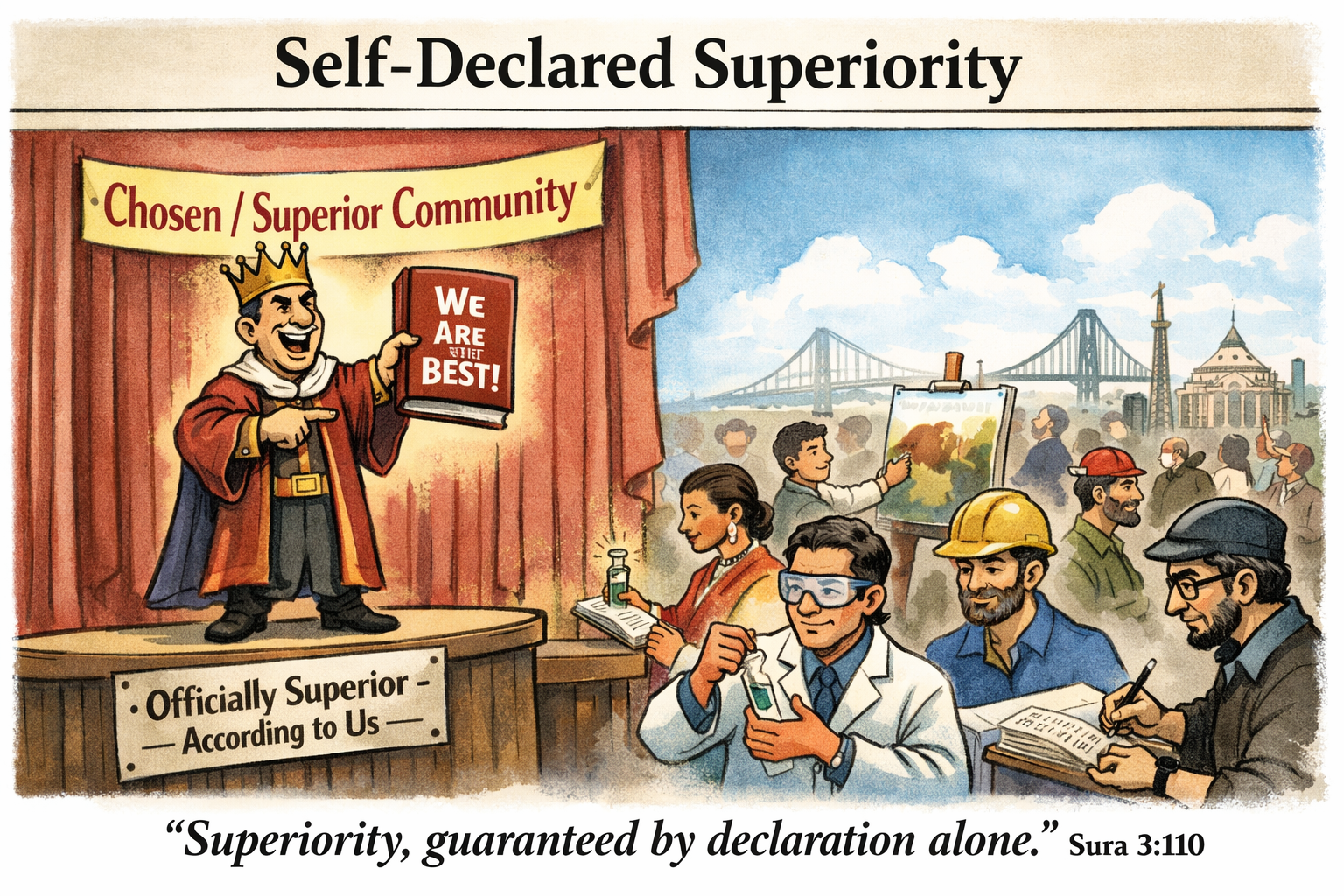 Het idee dat moslims als groep inherent superieur zouden zijn, is een monument van arrogantie verpakt in religieuze retoriek. Ethiek, moed, wijsheid en talenten bestaan in elke cultuur, elke samenleving en onder gelovigen én ongelovigen. Religie kan een kompas zijn, maar geen garantie voor moraal, intellect of vooruitgang. De realiteit is duidelijk: armoede, conflicten, corruptie en falende staten bestaan evenzeer in moslimlanden als elders, terwijl niet-gelovigen overal menselijke grootsheid hebben bereikt. Het is een misleidende generalisatie die individuele verdiensten ontkent, menselijke variatie negeert en de deur opent naar intolerantie en dogmatische zelfgenoegzaamheid. Superioriteit is geen religieus certificaat, maar een illusie.