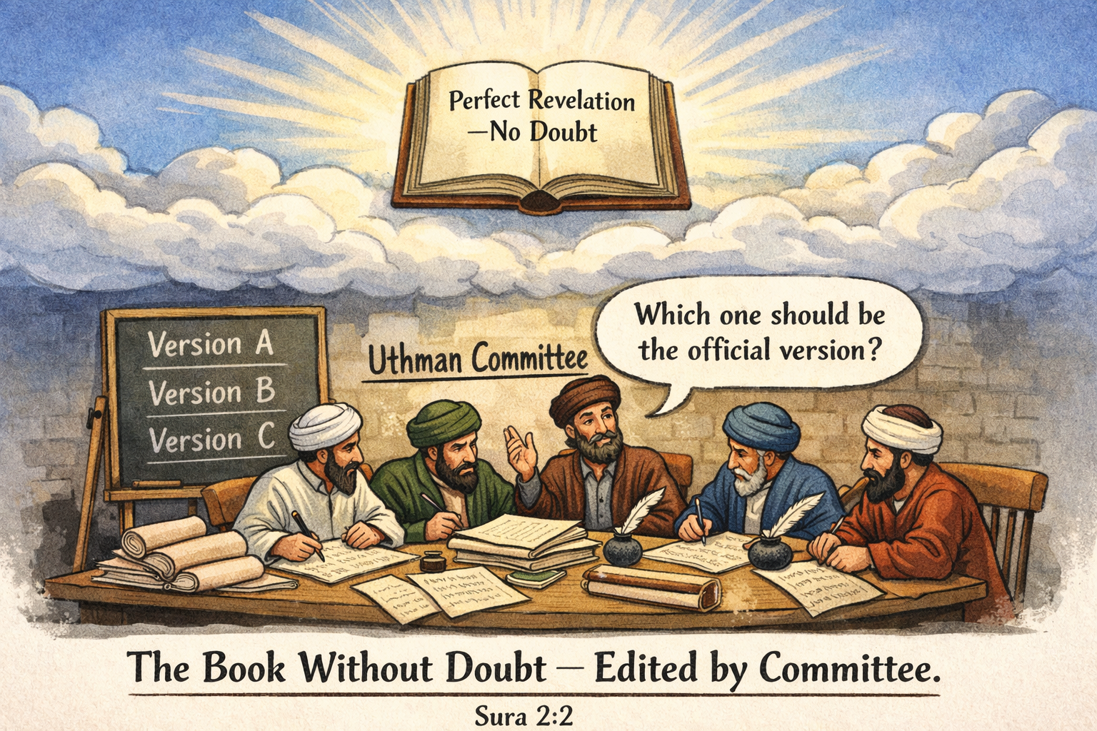 De formulering uit de Koran is in dit opzicht bijzonder onthullend. Het is geen argument vóór de waarheid van het boek; het is een voorafgaande immunisatie tegen kritiek. Wie twijfelt, zo suggereert de tekst impliciet, plaatst zichzelf buiten de kring van de rechtvaardigen. Daarmee wordt twijfel niet weerlegd maar gediskwalificeerd. Het is een retorische zet die we elders ook aantreffen: niet het debat winnen, maar het debat onmogelijk maken.
