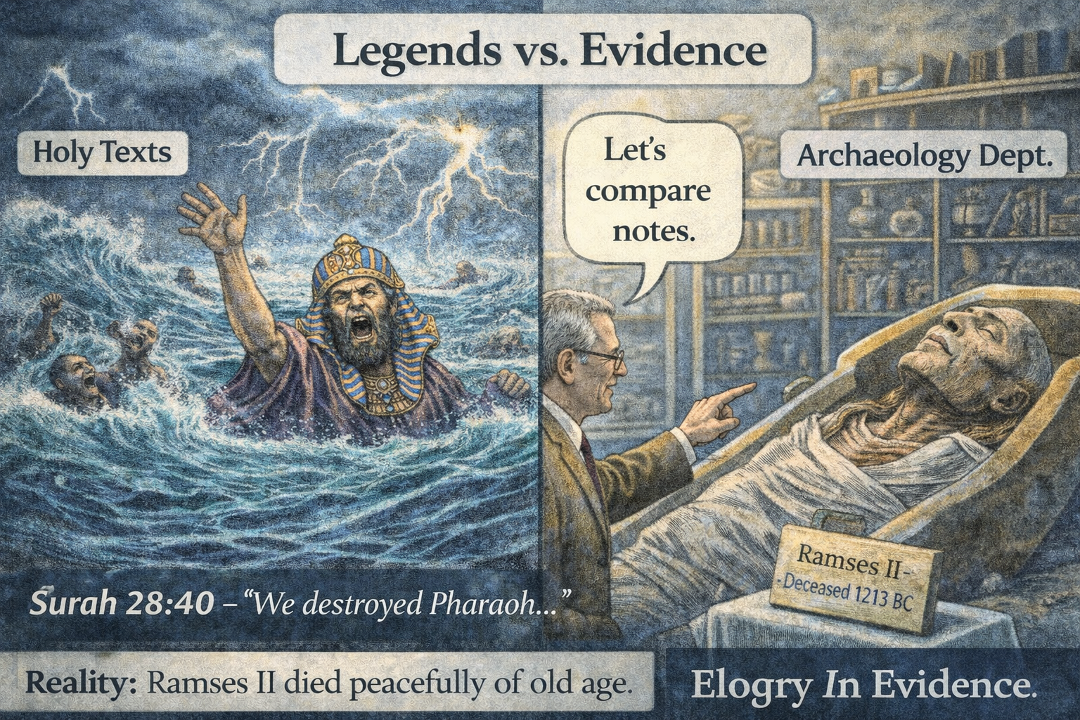 De Koran claimt dat de Farao en zijn leiders werden “vernietigd” in de zee, een klassieke dramatische climax. Historisch gezien stierf Ramses II in 1213 v.Chr., op een zeer hoge leeftijd aan natuurlijke oorzaken; er is geen enkel spoor van verdrinking of gewelddadige dood. Hier wordt een verhaal van kosmische gerechtigheid verkocht als historische feitelijkheid, terwijl de realiteit het volledig tegenspreekt. Het is een klassiek voorbeeld van religieuze retoriek die ontzag en morele les boven waarheid plaatst: een almachtige Schepper die dwingt tot bewondering, terwijl het bewijs, archeologisch of historisch, volledig ontbreekt.