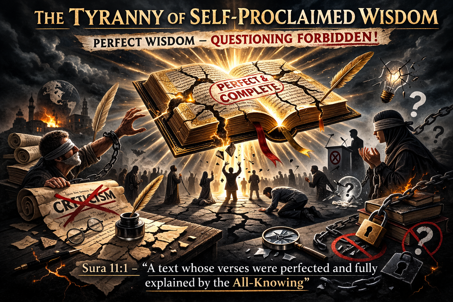 Het probleem is niet alleen filosofisch of theologisch: het is praktisch. Een samenleving die haar moraal, wetten en kennis baseert op een tekst die claimt “volmaakt en volledig” te zijn, remt vooruitgang, rationaliteit en menselijke verbetering. Het vers creëert een cultuur waarin twijfel wordt gestraft door sociale, intellectuele of zelfs religieuze druk.