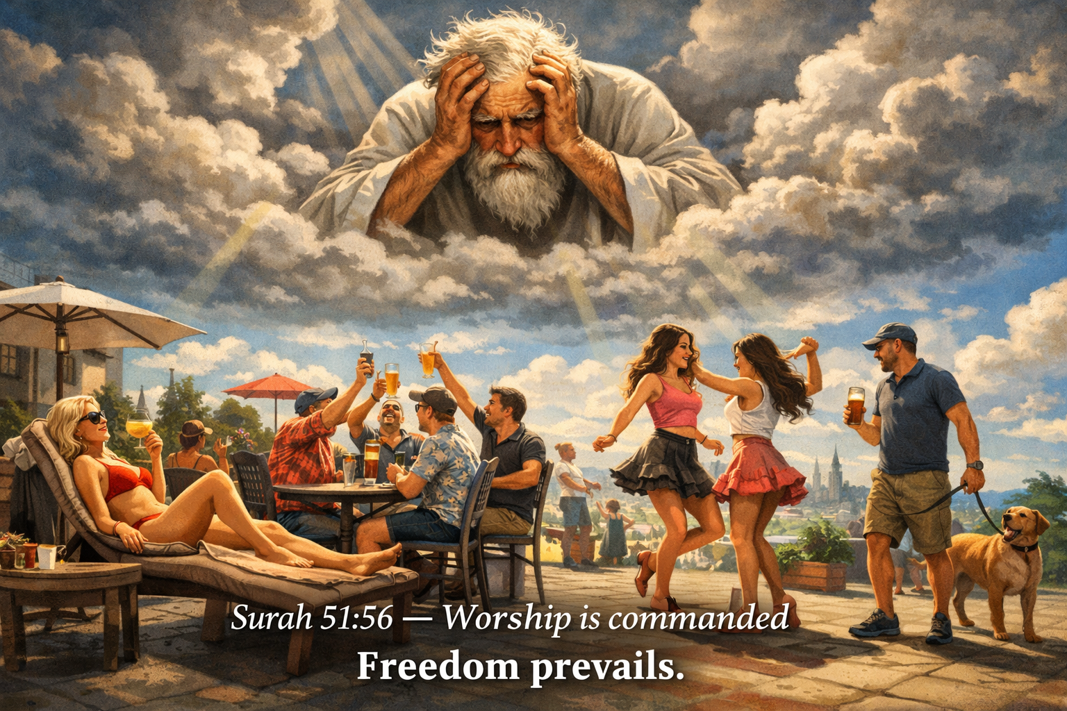 Kortom: Soera 51:56 reduceert het hele bestaan tot één enkel doel: aanbidding — alles daarbuiten lijkt irrelevant, alsof wat mensen echt doen, er niets toe doet. Waarbij het godsbeeld zichzelf als geslaagd voorstelt, terwijl het falen van Zijn schepselen onvermijdelijk leidt tot een eeuwige kloof tussen ideaal en realiteit. Als aanbidding werkelijk het enige doel is, dan is de schepping een monument van onvoltooidheid.