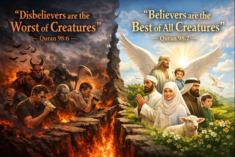 This image visualizes a literal moral hierarchy found in religious scripture, classifying believers and disbelievers in absolute terms. It reflects a specific theological worldview rather than an objective assessment of human beings. The illustration is presented to critically examine how such binary classifications function and what social effects they may produce.